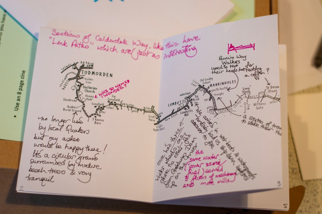 We held two map-making walks with cartographer Christopher Goddard. Chris has recently published a map of The Calderdale Way, which is currently the only map of it in print, so we were keen to involve Chris in the project. The map making sessions were open to the general public. They consisted of a walk through Broadhead Clough Nature Reserve, with various creative drawing and writing activities which broadened participants’ ideas of what a map can be.