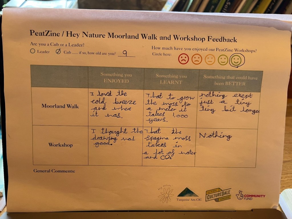 Mytholmroyd Cubs were our youngest participants, with two bespoke sessions delivered for them by Melissa Davie. The first was a nature walk around Heptonstall Moor where the Cubs were introduced to moorland ecology, and given a specially prepared ‘Nature Notebook’ activity booklet to fill out. The Nature Notebook will be published with PeatZine and Melissa will use it for future nature-awareness projects.