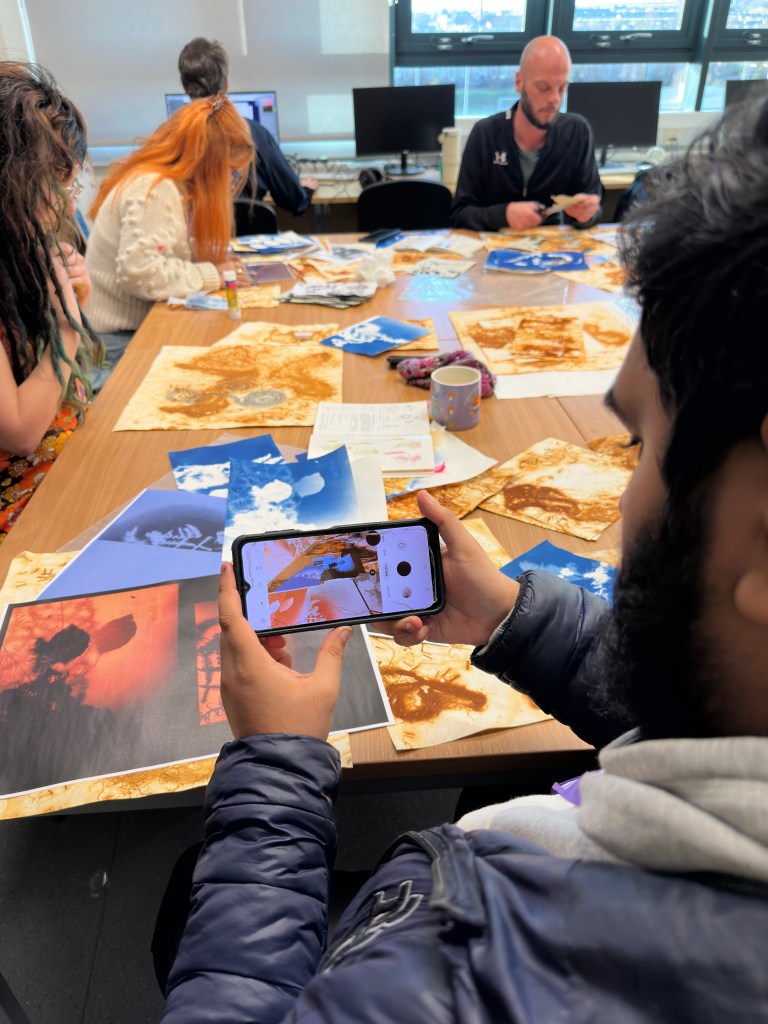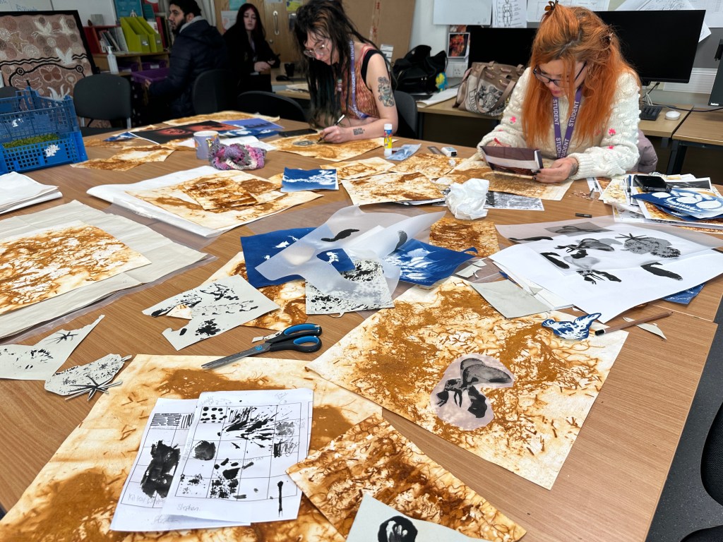 The following week Sheila ran a creative workshop at the college, showing students how to create rust prints and cyanotypes which responded to the subject matter they’d been introduced to the previous week. The artworks created in this workshop were displayed at the exhibition and are used in the zine. This gives art students, right at the beginning of their academic art career, the opportunity to have their work publicly displayed and published.